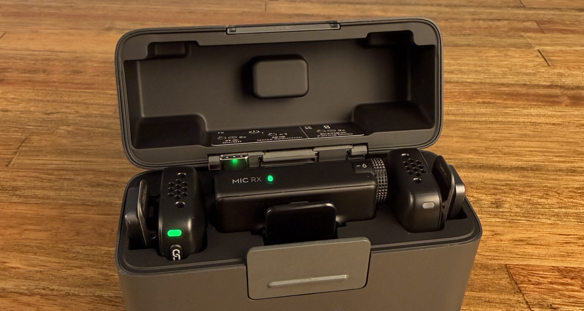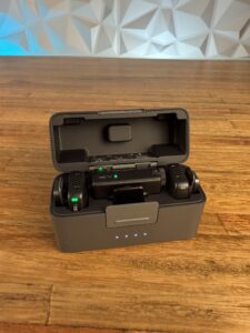 Pero la magia reside en el estuche de carga. Este compacto estuche no solo protege el equipo, sino que es capaz de recargar completamente el set (2 TX + 1 RX) unas 3.6 veces. Esto eleva la autonomía total del conjunto hasta unas increíbles 48 horas, lo que te permite olvidarte de los enchufes durante días enteros de rodaje.